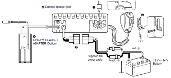 ICOM公司OPC-871A选件实现外接耳麦的收发转接应用,一边连接主机内部专用插头,另一端适配航空标准耳麦如David Clark co.的戴维克拉克航空耳麦,在直升飞机上经常看到。