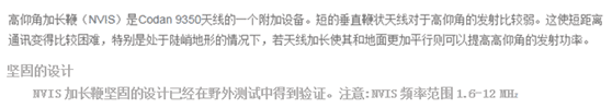 我们常见的CODAN 9350自动调谐天线在天线鞭一定的条件下电台都是有合适工作范围的,在其频率选择上也有相关要求,在其说明书中如下描述就是例证。