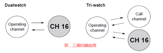 在实际工作中,一般要求在工作信道外要监听6或16CH已保证航行安全,这时就要用到扫描功能中的DUAL WATCH ORTRI-WATCH功能了。下图为IC-M37船用对讲机的扫描示意简图。