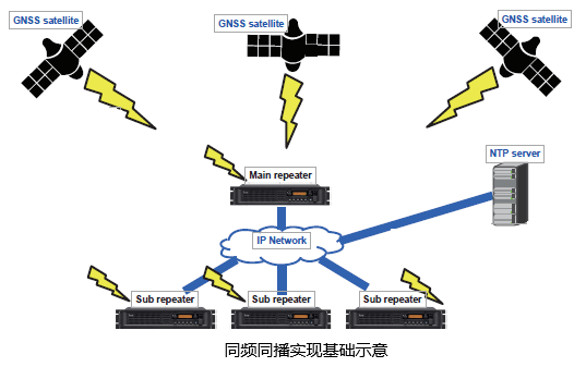 为解决上述问题,同频同播系统应运而生,它采用一对中继频率应用于覆盖范围内的所有中继台,采用主-从中继台的管理方式利用GPS时钟和NTP服务方式统一下发语音和数据实现系统一对频率,无干扰无缝隙通讯的目的。这种系统移动终端兼容性好,无须跨区扫描,省电省心的目的。