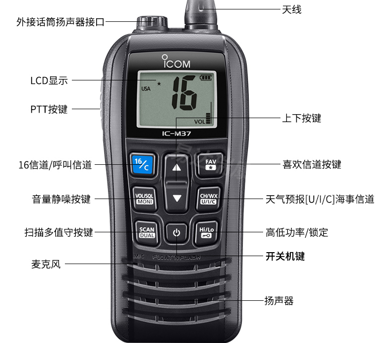 专用于海上航行的海事船舶上以及与岸上进行无线通信的无线对讲机称为海用无线对讲机,也称为船舶电台。海用对讲机是性特别强的对讲机,其使用环境恶劣,船舶活动范围广阔,海上温度变化又大,要适应全球海上安全航行的需要,其产品设计是十分的,工作频率也是统一的按照国际海事通信的统一规定海上船用对讲机的工作频率范围。TX从 156.025MHz-157.425MHz,RX从156.050MHz-162.025MHz。工作频道又分为国际频道、美国频道和加拿大频道,还有10个气象频道(其中8个是美国气象频道,2个是加拿大气象频道)。三种工作频道也就是三个频道标准版本,用户根据使用要求,在选购船用对讲机的同时也选用不同版本的频率。采用美国频率标准版本的国家较多,我国船用对讲机大多采用美国版本,据说可能是美国频率版本的同频点较多,异频点较少。目前共划分出57个频道,频道号为1~28和60~88,其中单工频道20个,双工频道35个,保护频道2个。88以上为私人频道(如美国各港口设置的USA信道)。57个频道中有些特殊频道,专门用于某些作用的通信,包括以下这些: