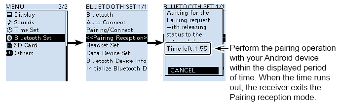 上述设置后在MENU/Bluletoothset/Pairng Reception/进入配对等待屏幕。