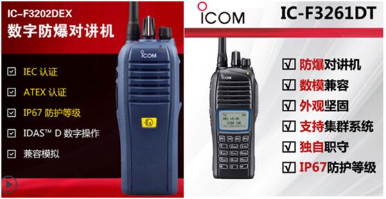 机厂家和ICOM株式会社厂家生产的进口品牌防爆对讲机,当然其他品牌也有在陆续洽谈和销售。下图为 IC-F3020DEX/4202DEX为氢其防爆对讲机,为高等级防爆对讲机。