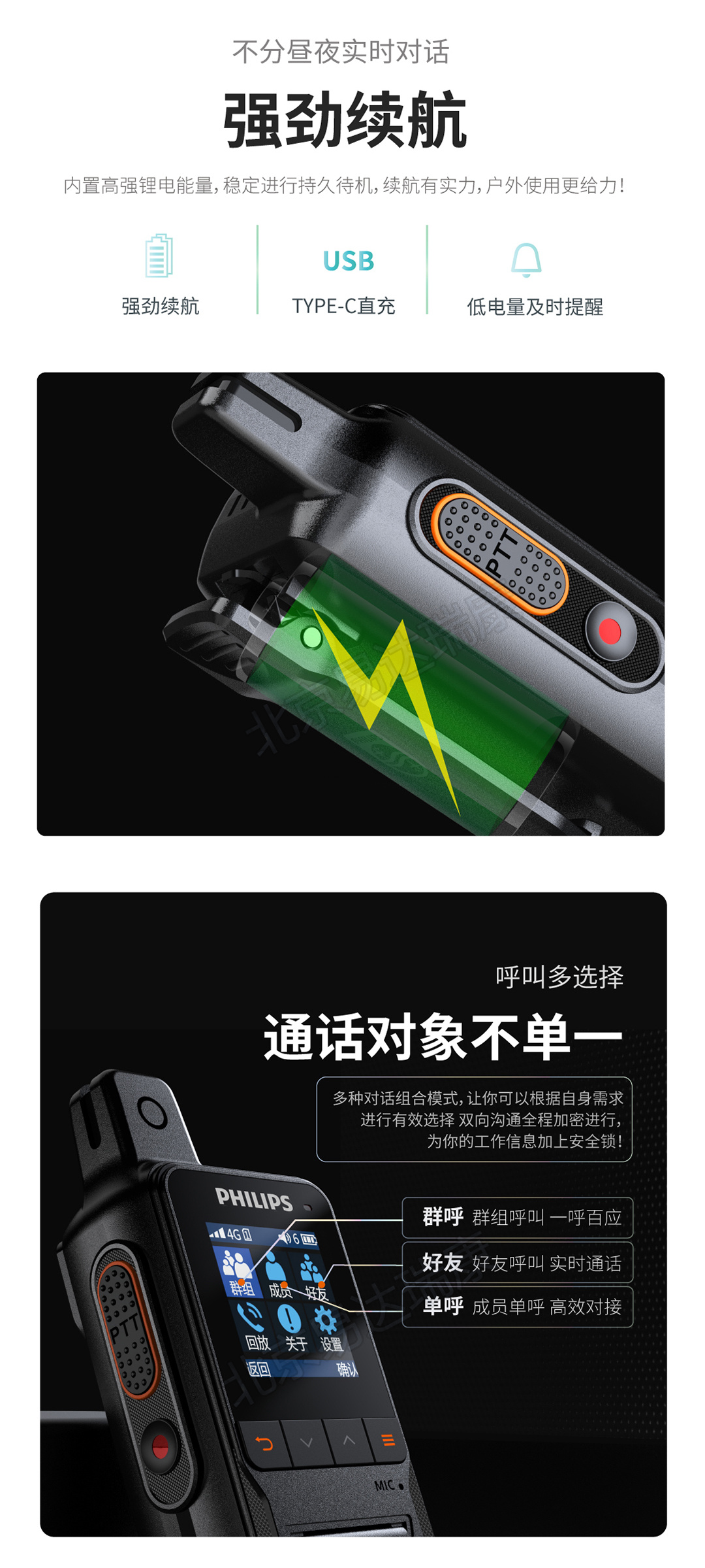 飞利浦公网智慧语音终端: 双卡双待/全国/公网对讲/云端录音/智慧平台高效管理/快捷PTT呼叫/强劲续航/TYPE-C直充/可拆卸电池/ 续航无忧/智能降噪/对讲