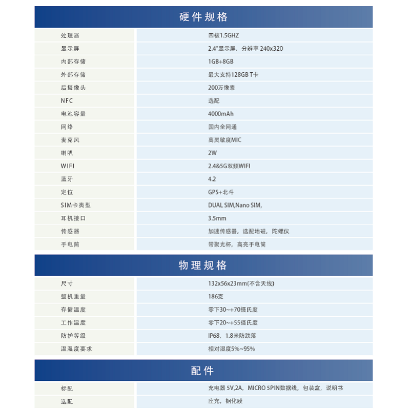 IP68防护等级 手感舒适 1.8米防跌落 携带方便 -键PTT 2W大喇叭 -键手电筒 声音洪亮. 4000毫安 独立3.5mm 电量管够 耳机接口 安卓系统 支持多种应用