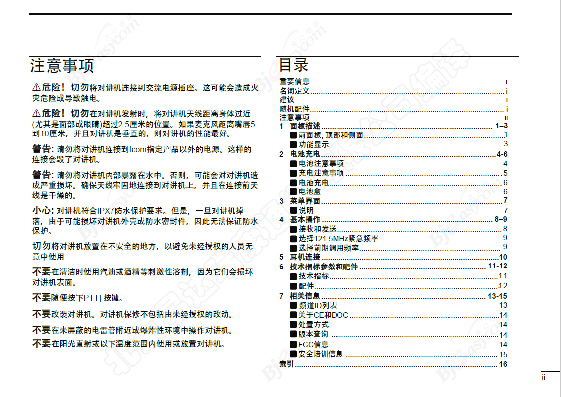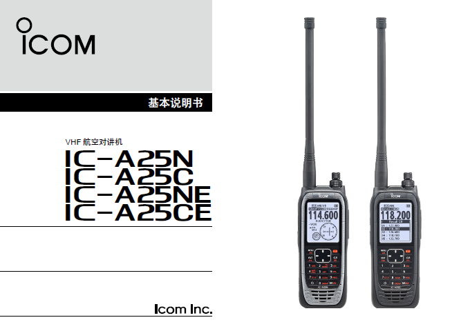 本手册包含IC-A25N,IC-A25C,IC-A25NE和IC-A25CE的基本功能和操作说明,在使用对讲机之前,请仔细阅读所有的说明。