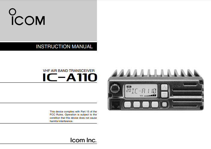 IC-A110航空电台使用尤其注意遵守航空通讯的要求。FCC 告:未经 Icom Inc. 明确批准而对本收发器进行更改或修改,可能会使您根据 FCC 规定操作本收发器的权限失效。告! 切勿使用耳机或其他音频配件以高音量操作对讲机。 听力专家建议不要进行持续的大容量操作。 如果您感到耳鸣,请降低音量或停止使用。