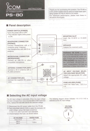 ICOM 的PS80是A220/A210产品台式应用的固定外壳及附件组件,利用它可以实现220VAC供电,像普通电台那样桌面或移动使用。